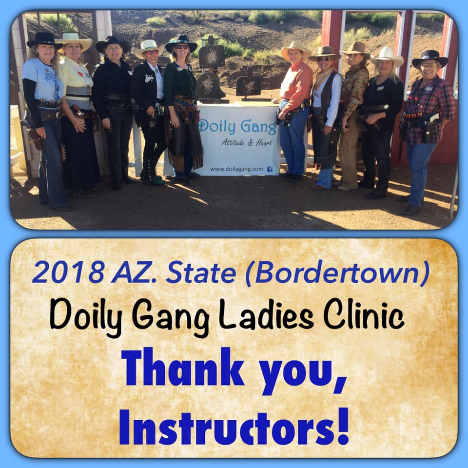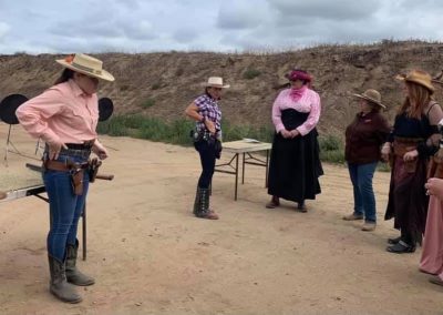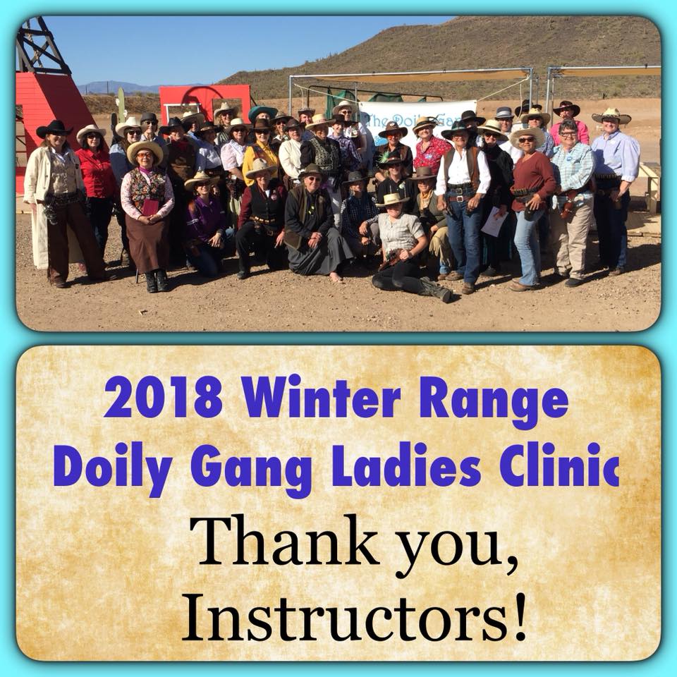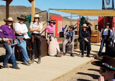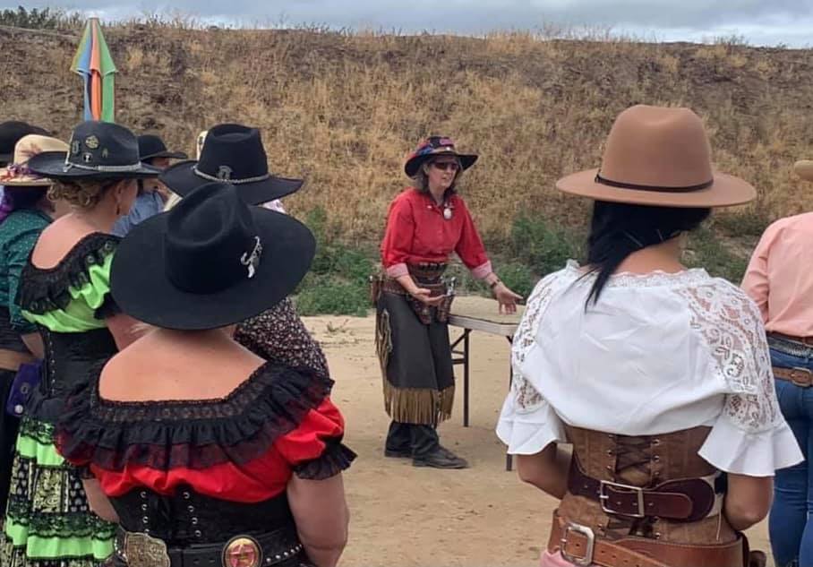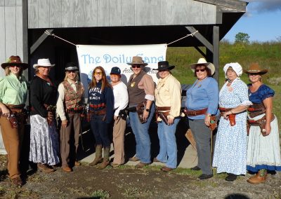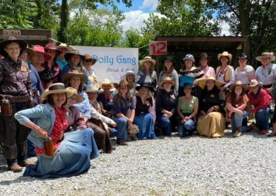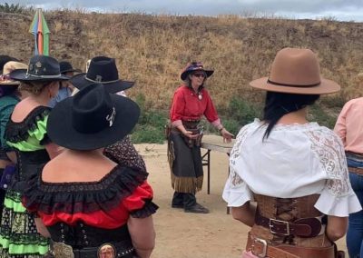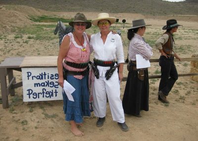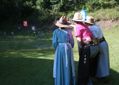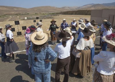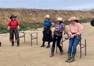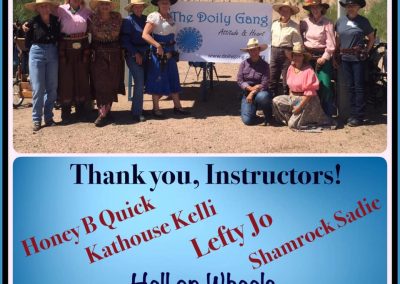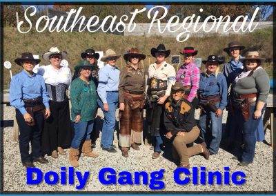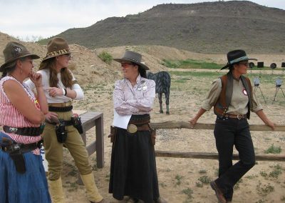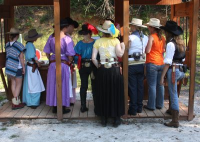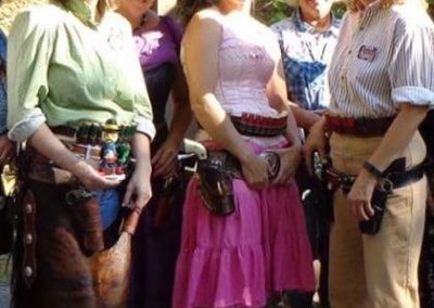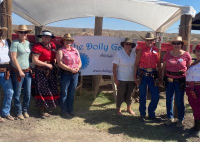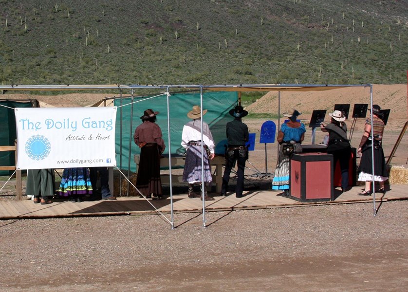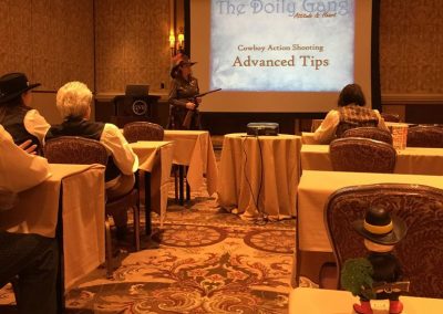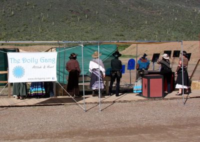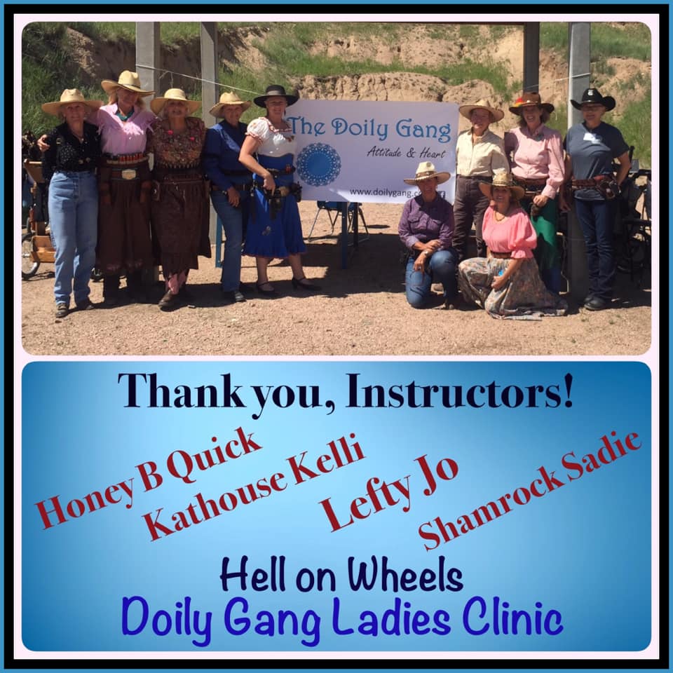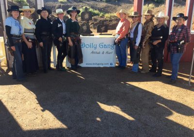 The Doily Gang hosted ladies’ clinics with the purpose of helping cowgirls improve their game. These clinics were not an introduction to Cowboy Action Shooting™, but instructors provided tips and techniques on shooting stance, drawing pistols, levering rifle, loading/shucking the shotgun, staging guns, transitions, practice tips, the mental game, etc.