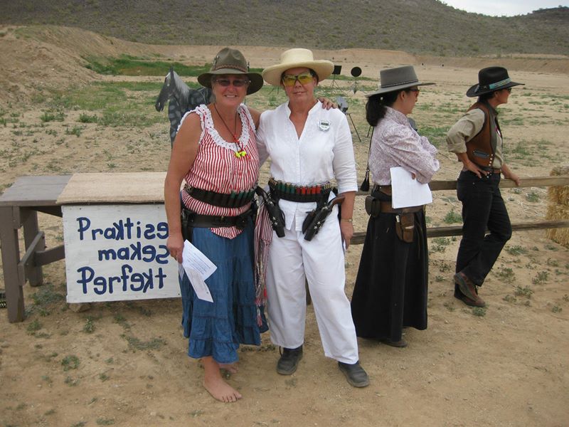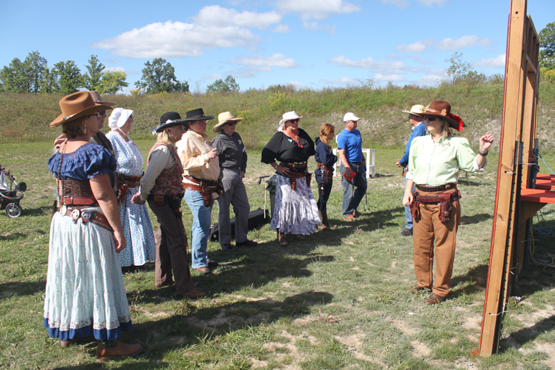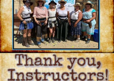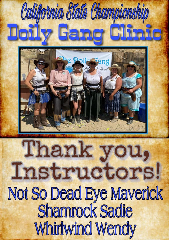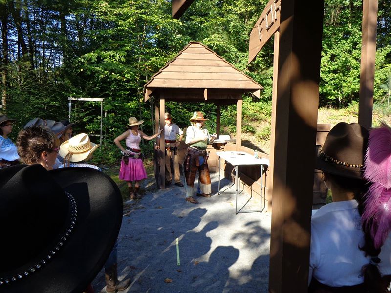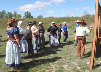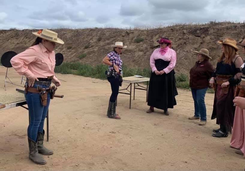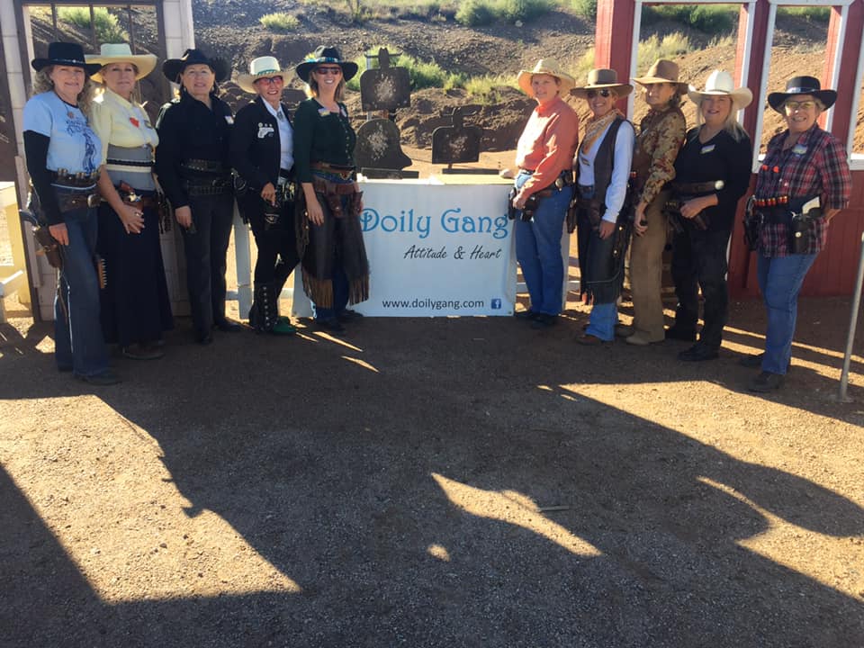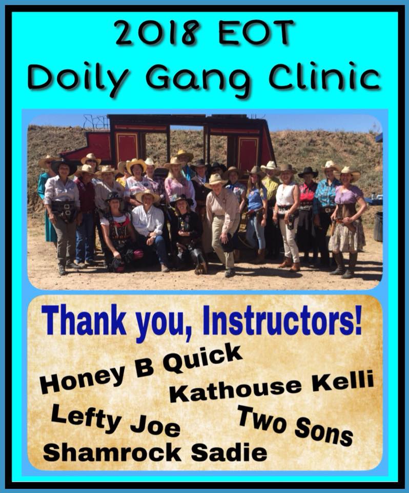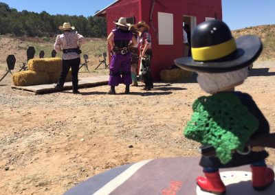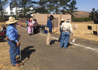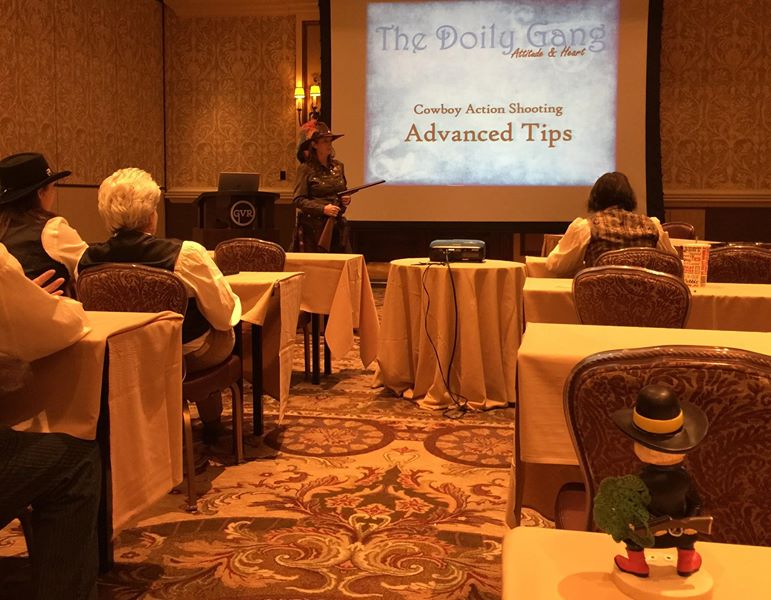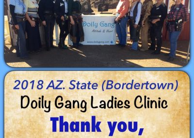 The Doily Gang hosted ladies’ clinics with the purpose of helping cowgirls improve their game. These clinics were not an introduction to Cowboy Action Shooting™, but instructors provided tips and techniques on shooting stance, drawing pistols, levering rifle, loading/shucking the shotgun, staging guns, transitions, practice tips, the mental game, etc.